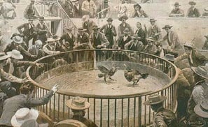 zur zeit der migration in mexiko und in südamerika erfreuten sich die hahnenkämpfe einer grossen beliebtheit. angeblich wurde dem unterlegenen hahn am ende des kampfes der schwanz ausgerissen und dem besitzer des siegreichen tieres als trophäe überreicht. um den sieg gebührend zu feiern trank man "on the cocks tail“, woraus sich nach der geschichte die kurzform cocktail abwandelte.