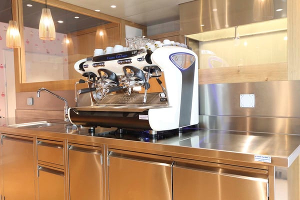 im hintergrund lässt er in der eigens für die espressomaschine mit installierten kaffeemühle gerade die bohnen für den nächsten espresso mahlen.