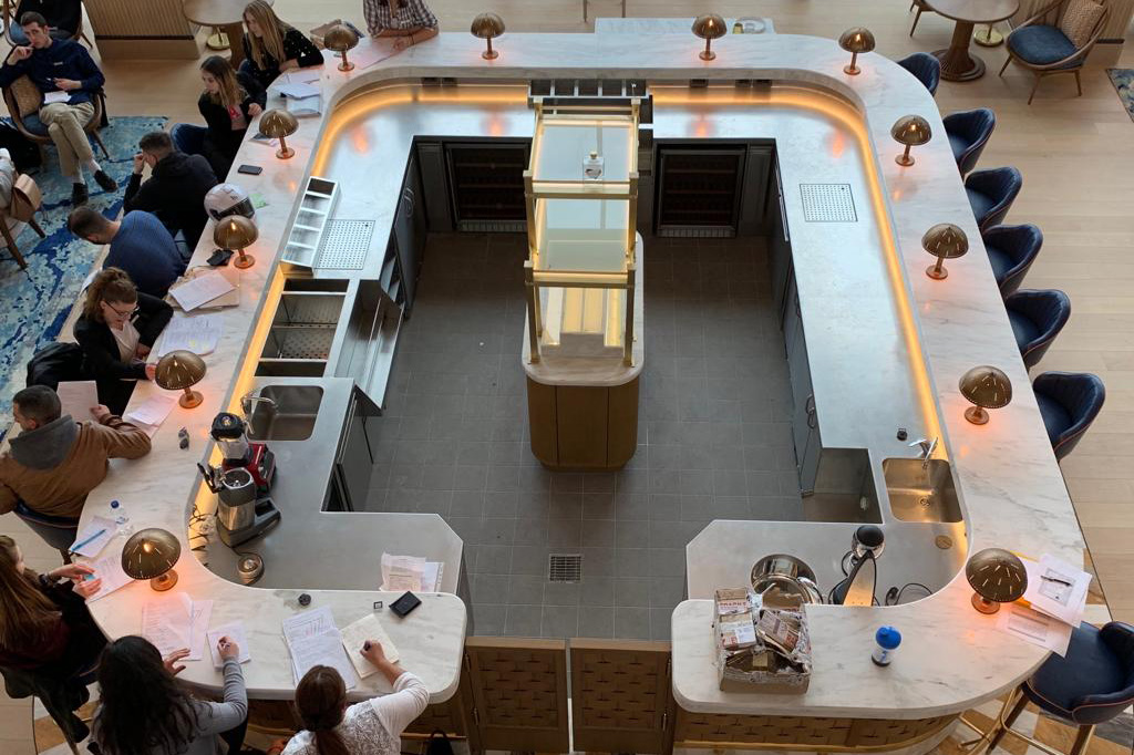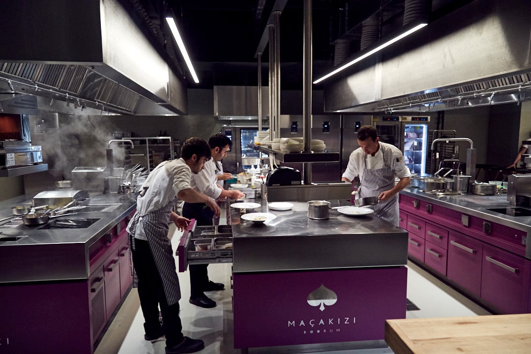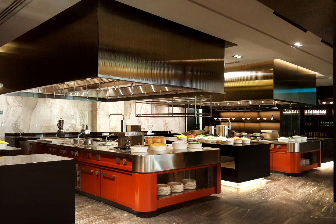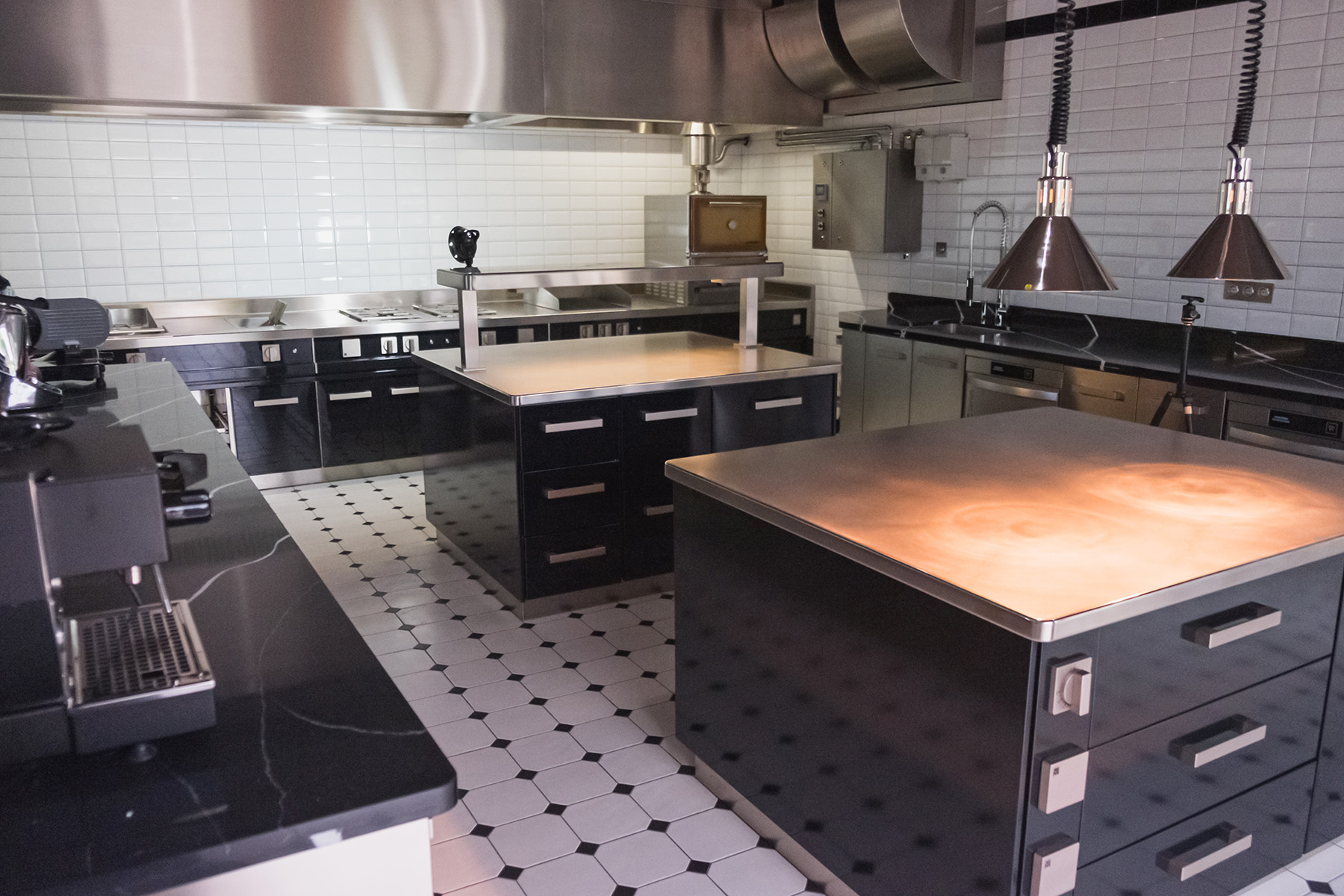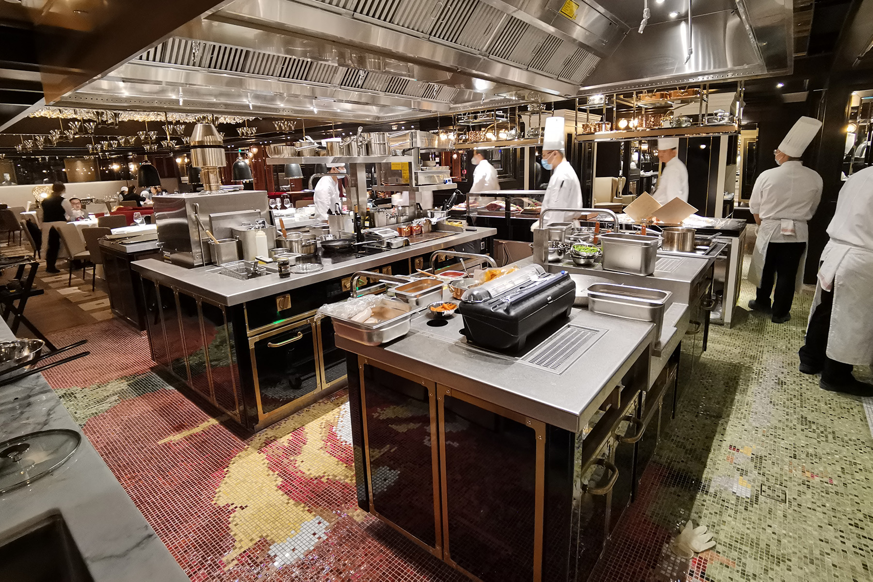 die premiumküche selber besteht aus vier kochnischen und fünf kühlregalen, welche vollständig aus edelstahl aisi 304 gefertigt und mit diversen marmoreinlagen und -details verziert sind. alle einheiten sind mit den modernsten professionellen technologien sowohl für die zubereitung und die kühlung aber natürlich auch für das kochen selber ausgestattet. unter den vier kochsuiten sticht der chef table als das highlight des projekts hervor. einerseits ist er das herzstück des show-cooking-erlebnisses für exklusive gäste: die völlig offene küche und die zubereitung der gerichte durch den chefkoch vor den augen der gäste verwandeln die kunst des kochens in reine unterhaltung. auf der anderen seite ist der chef table die zentrale verschmelzung der beiden materiellen seelen: der stahl von marrone, der doppelt so dick ist wie sein ohnehin schon bemerkenswerter standard, und der marmor von margraf, der in seinem natürlichen zustand als stein zum ausdruck kommt, die beide mit einzigartiger kraft verschmelzen.