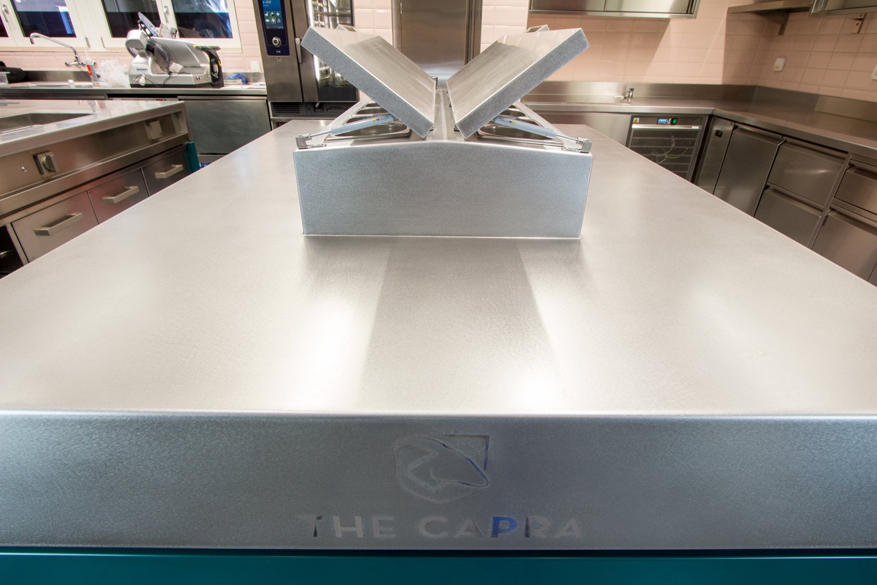 dessen fronten und kopfteile sind in einer speziellen ral farbe gefärbt, die arbeitsoberflächen sind handvibriert und an der kopfseite prangt stolz das per laser in den edelstahl gebrannte unternehmenslogo. die gemmet handels ag zeichnete für die koordination der fertigung und die montage der neuen küche im the capra in saas-fee verantwortlich. verbaut wurde ein massgeschneiderter marrone premium herdblock in edelstahleinfassung (inklusive sämtlicher kühlmodule), der sämtliche kundenwünsche berücksichtigt - sowohl hinsichtlich funktionalitäten, arbeitsprozessen als auch des designs.