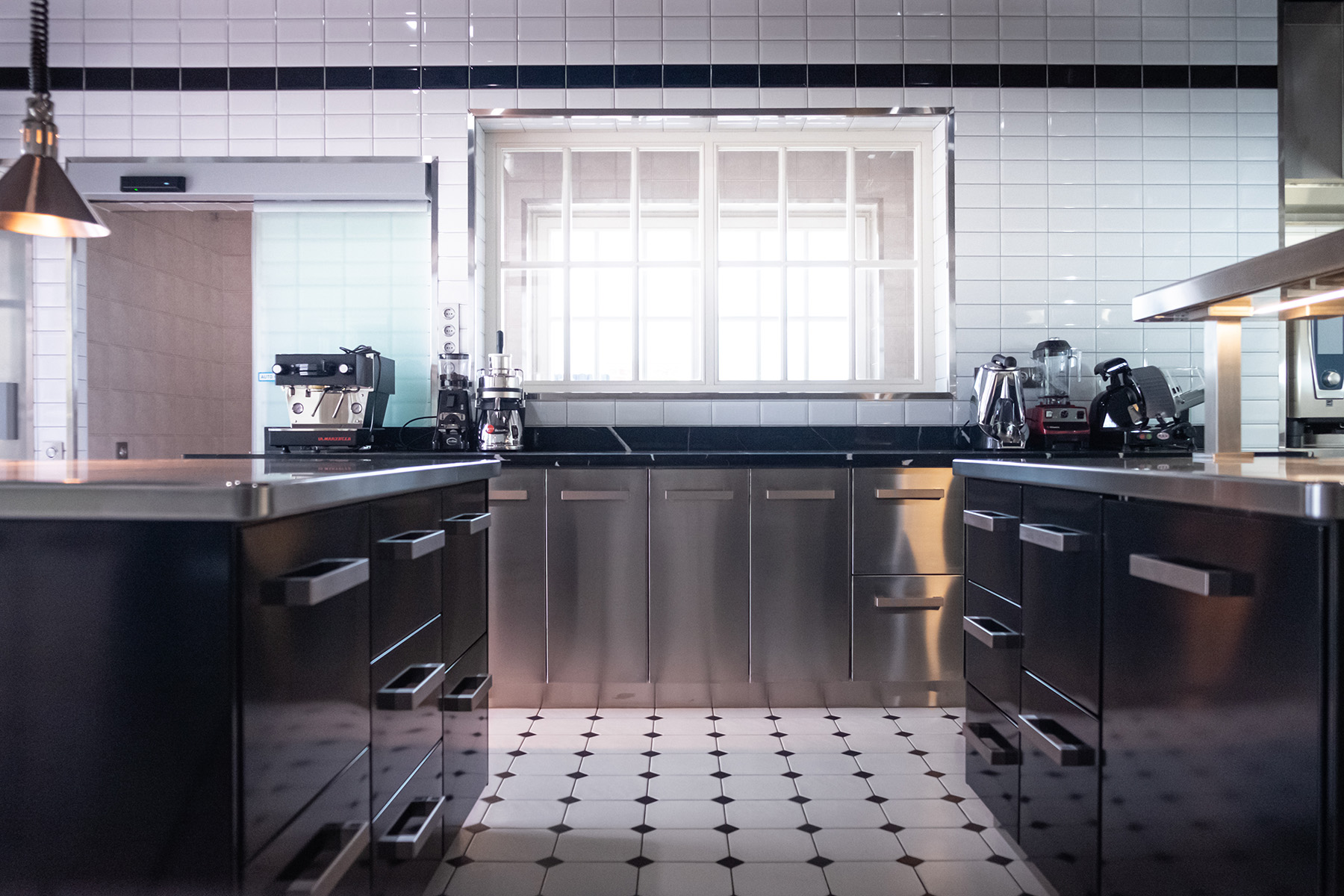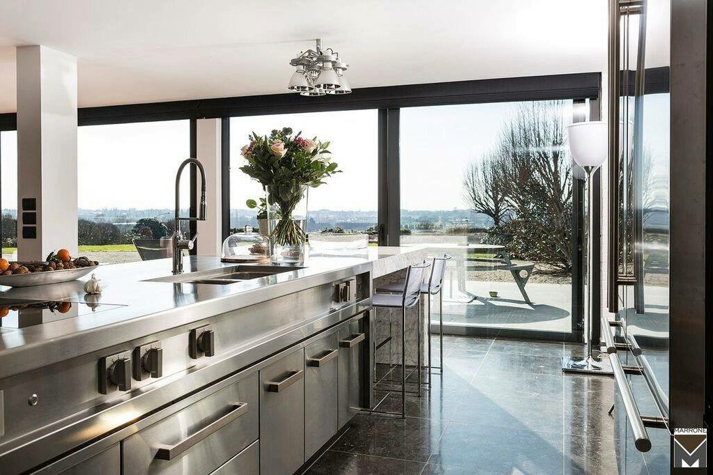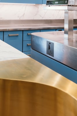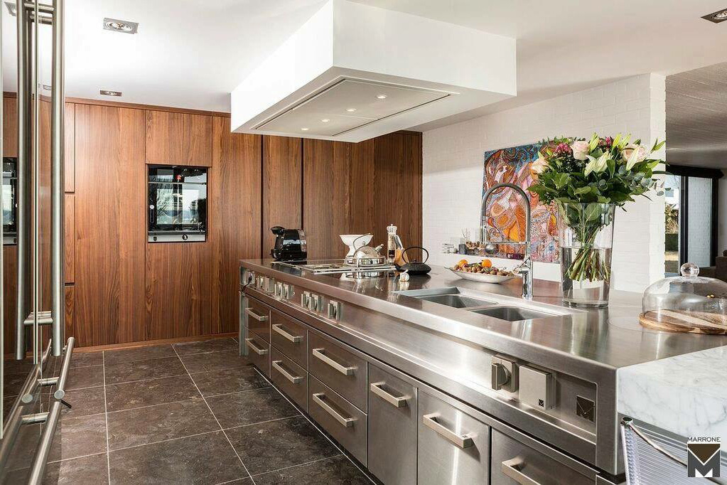 bei diesem küchenprojekt stand die kontrastreiche und zugleich harmonisierende, zeitlose komposition von stahl und marmor im mittelpunkt. mit arabescato grigio orobico wurde ein äusserst hochwertiger wolkengrauer italienischer marmor mit hellen und dunklen schattierungen sowie adern in farben von braun bis blassrosa verbaut. er diente als natürliches material für den überaus markanten, extrem ausdrucksstarken und imposanten chef table, der mit einer länge von 4 metern, sowie einer breite und höhe von je 90cm wuchtig und doch anmutig zugleich das hauptaugenmerk im mittelpunkt des raumes darstellt. er passt dabei in seiner form perfekt zu seinem metallenen gegenstück, so dass der eindruck entsteht, die beiden elemente seien untrennbar miteinander verschmolzen.