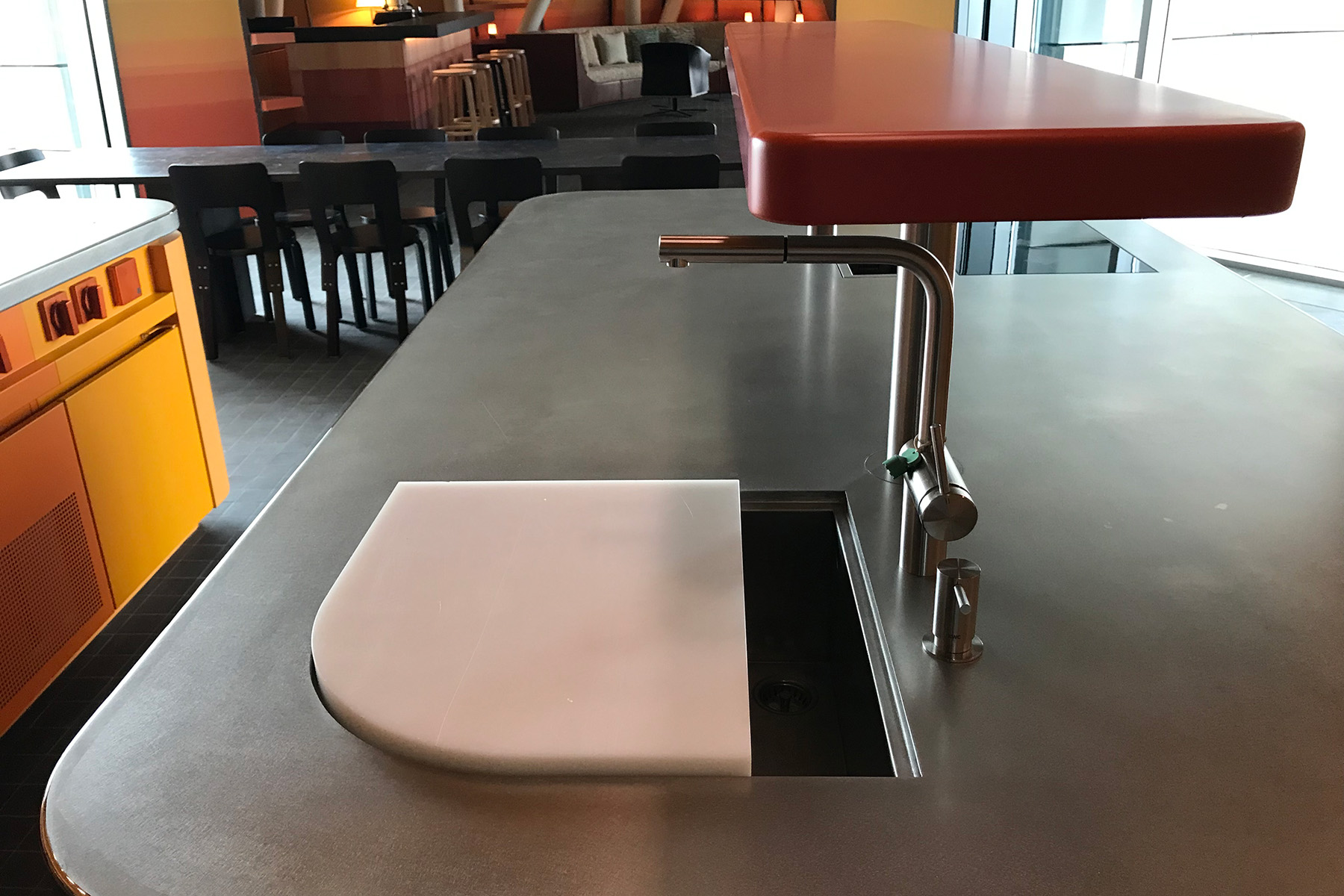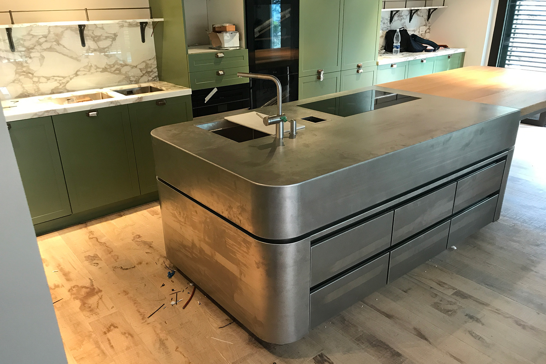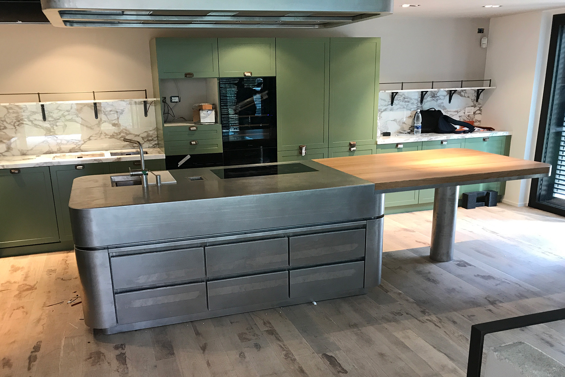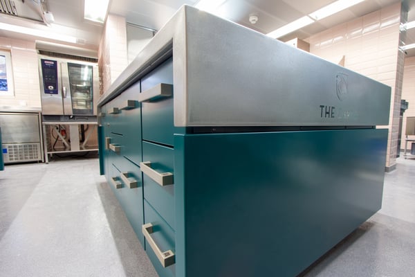 der mittelkorpus, welcher gleichzeitig blickfang für die gäste des chef table ist, wurde in einer speziellen grünen ral farbe eingefärbt, die oberfläche ist zudem handvibriert.