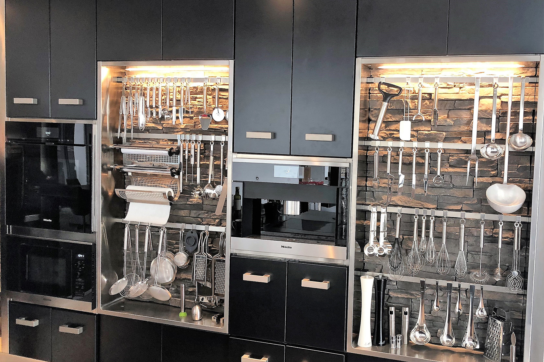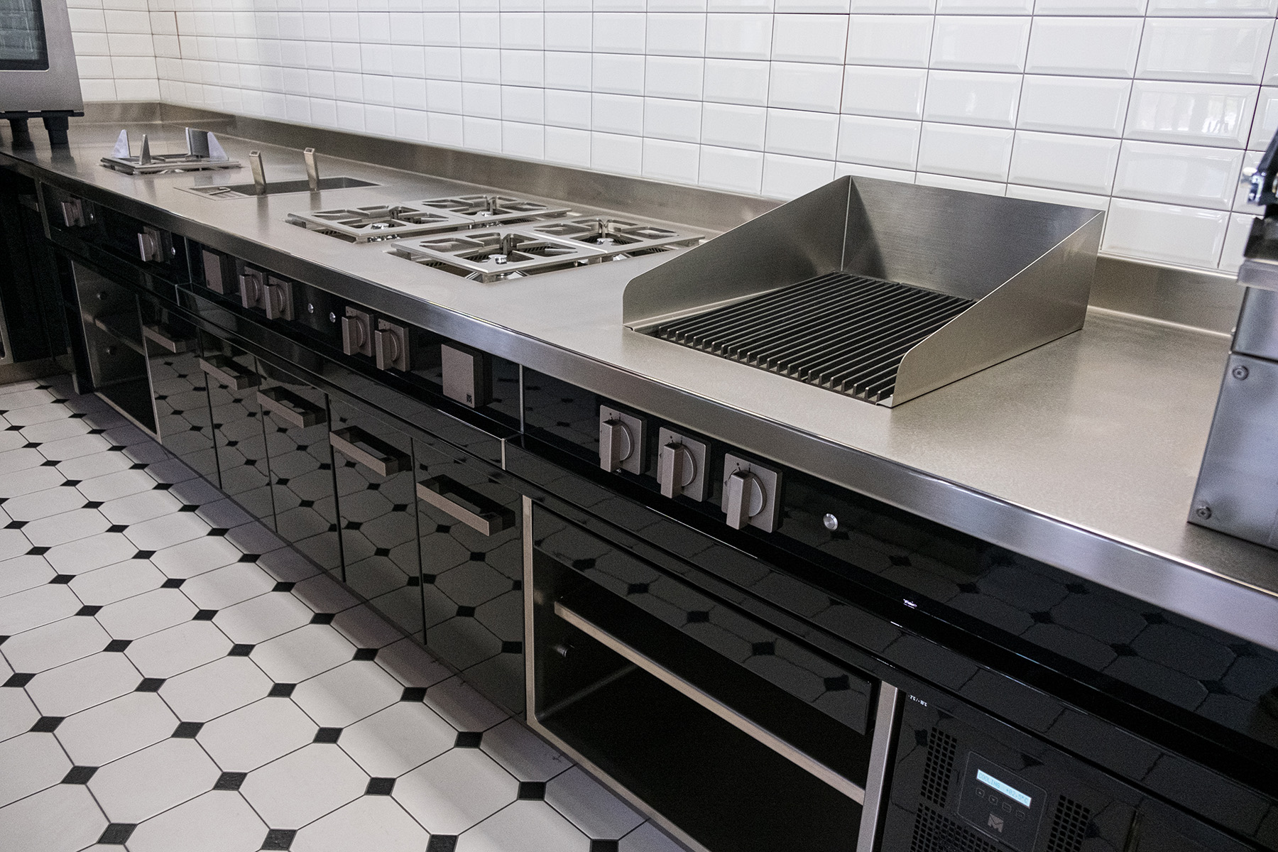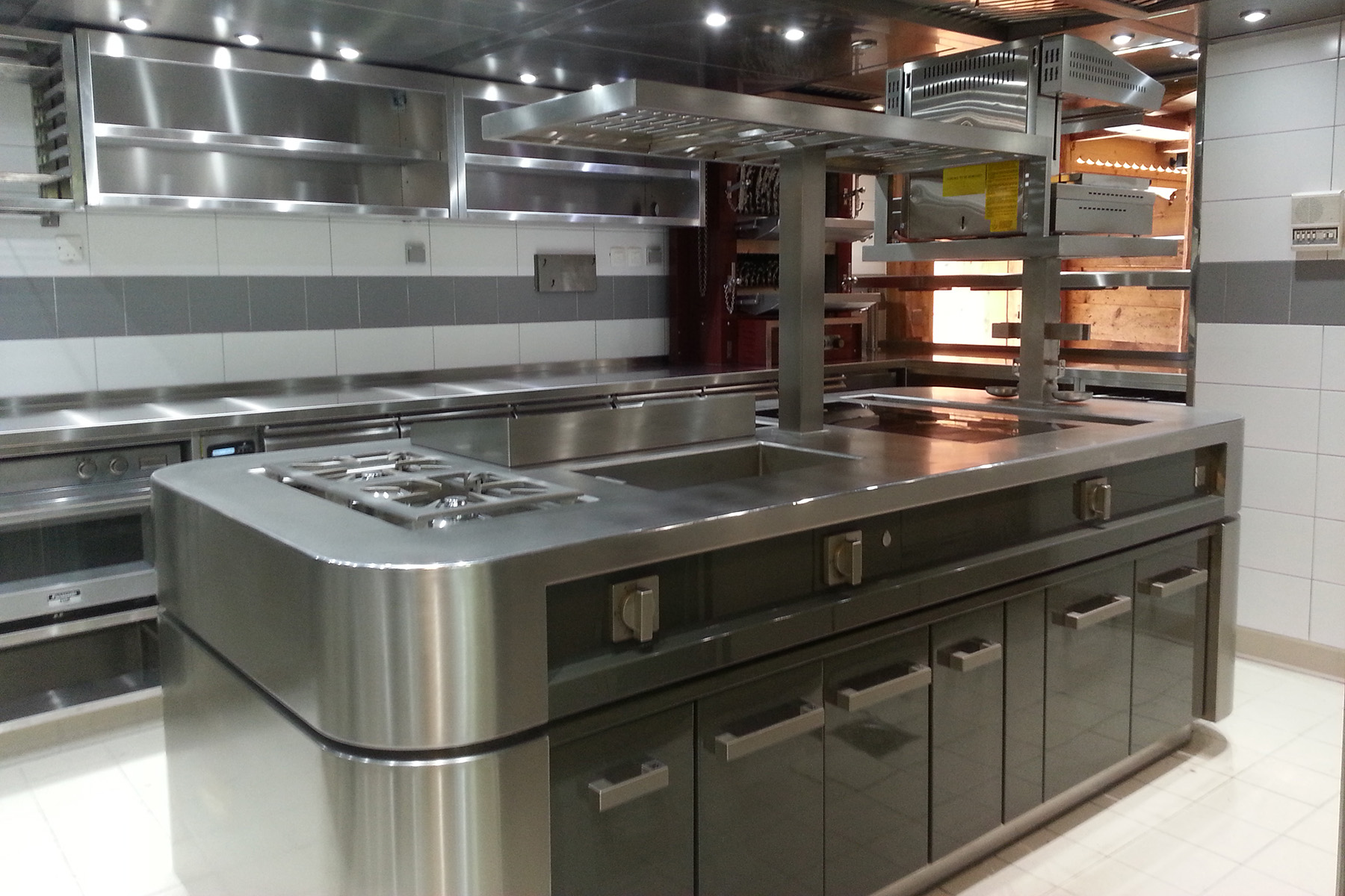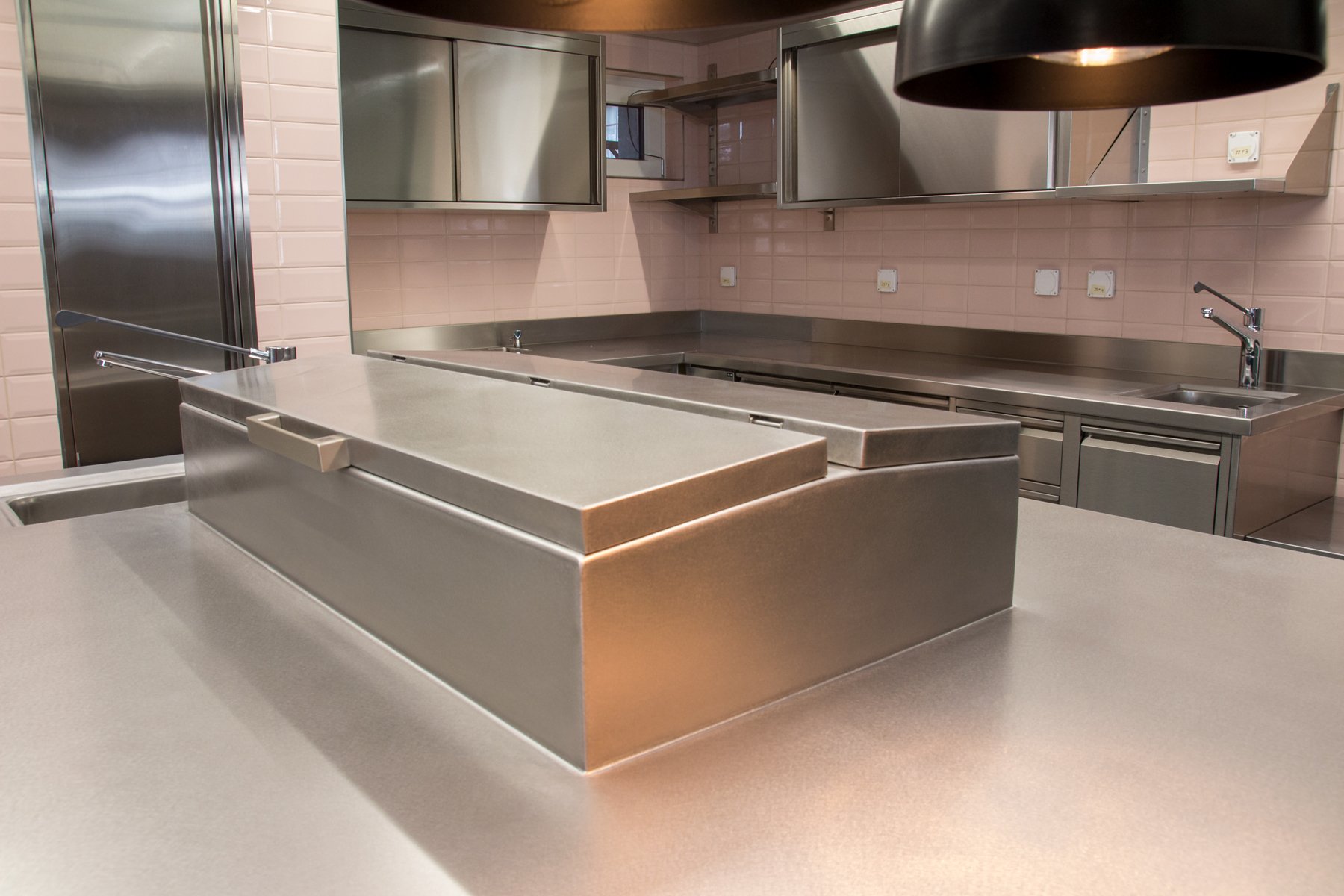 insgesamt wurden in der neuen küche drei korpusse montiert. sie alle kennzeichnen spezielle abdeckungen, inklusive der schrankfronten und der griffe. bei sämtlichen arbeitsflächen kam durchgehend besonders hochwertiger, handvibrierter edelstahl zum einsatz.