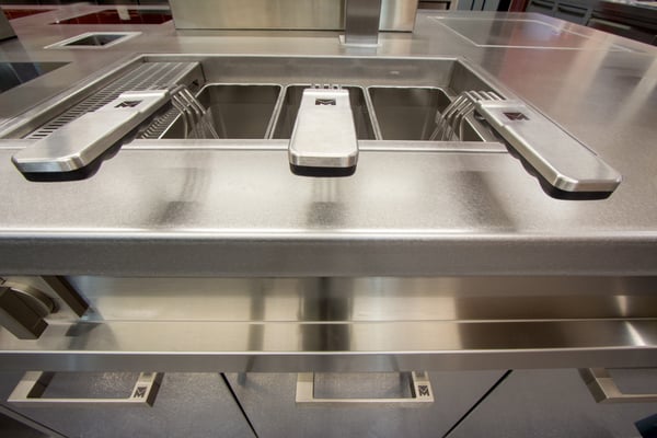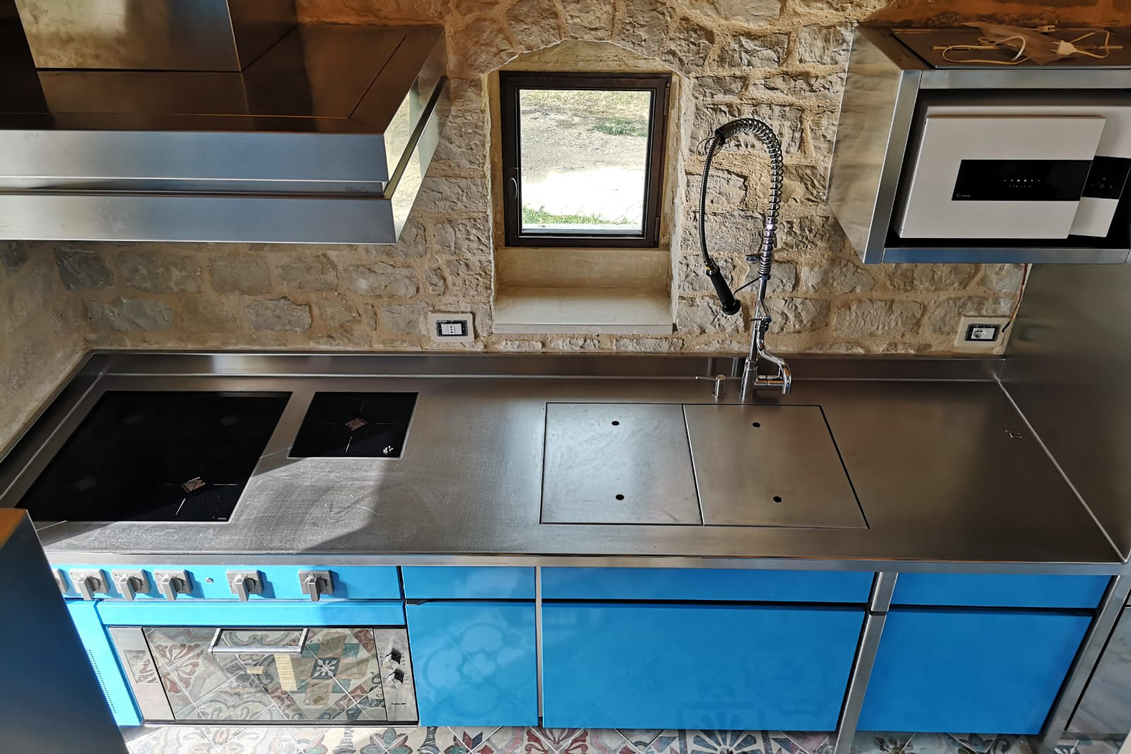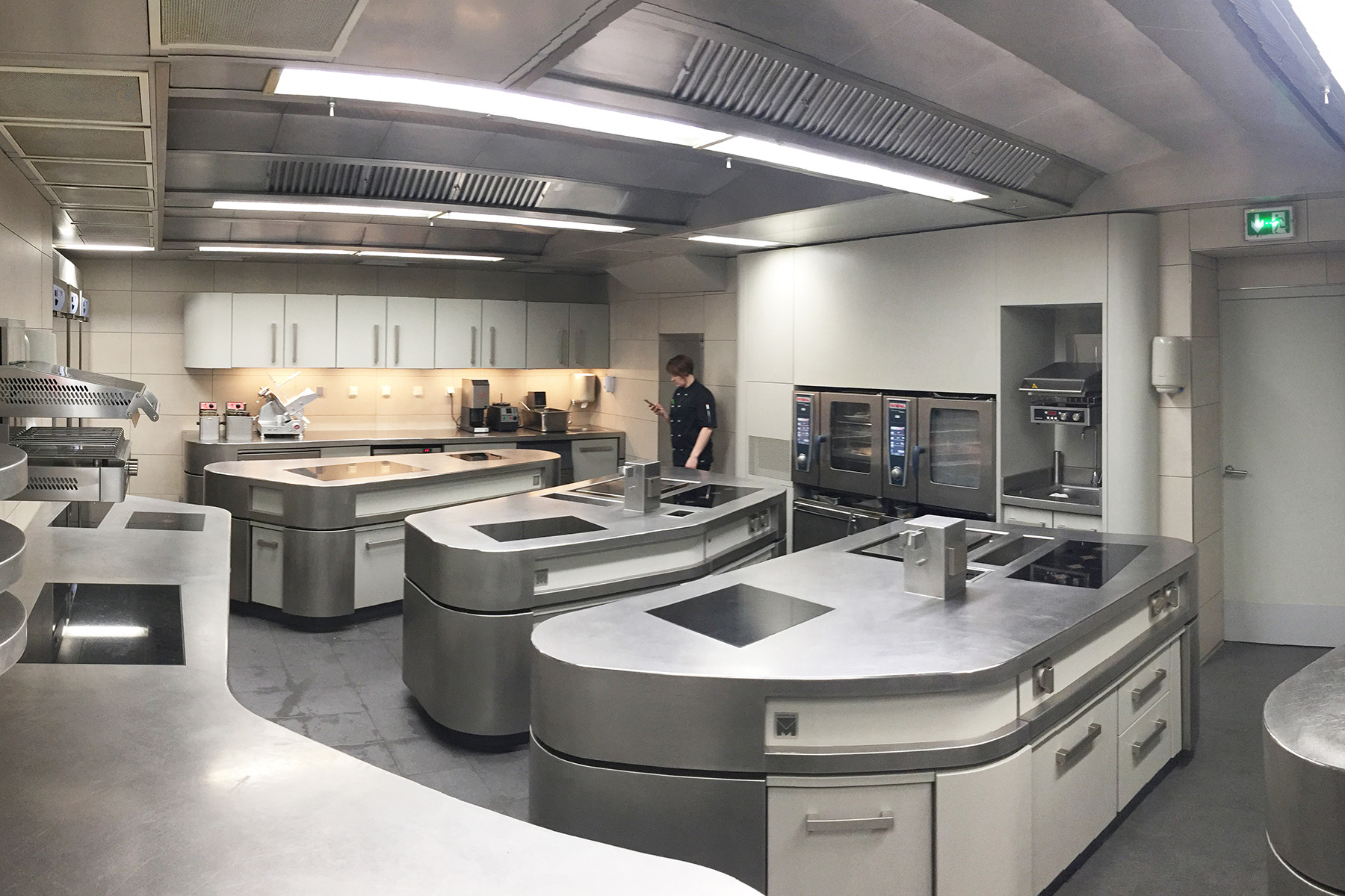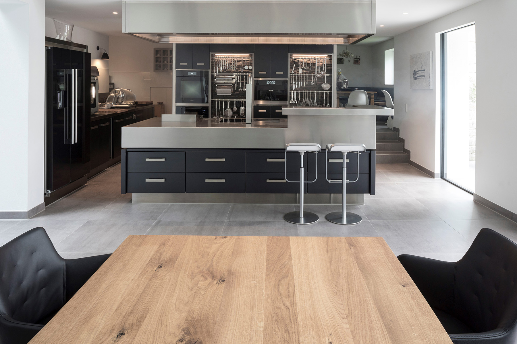 insgesamt wurden in der neuen küche drei korpusse montiert. sie alle kennzeichnen spezielle abdeckungen, inklusive der schrankfronten und der griffe. bei sämtlichen arbeitsflächen kam durchgehend besonders hochwertiger, handvibrierter edelstahl zum einsatz.