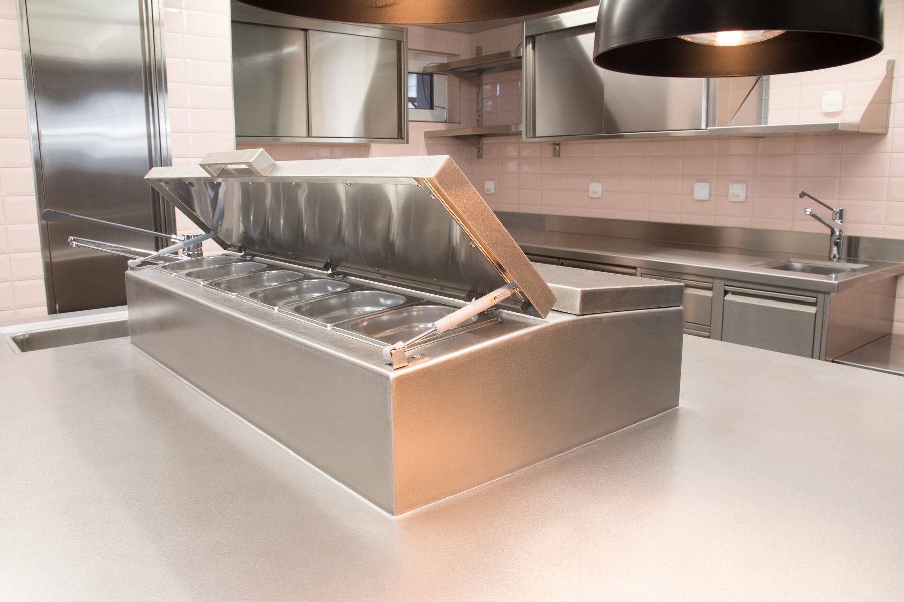 der elegante block trägt zwei spezielle, direkt auf dem tisch eingeschweisste kühlaufsätze mit hydraulisch absenkbaren deckelelementen und beinhaltet zudem diverse kühlunterbauten. an der einen kopfseite sind zwei wärmelampen montiert, da dieser bereich auch als pass und somit als ausgabestelle für das fine dining am chef table fungiert. auf der front der kopfseite prangt genau an dieser stelle das markante marken-logo des luxuriösen alpenlodge-hotels.