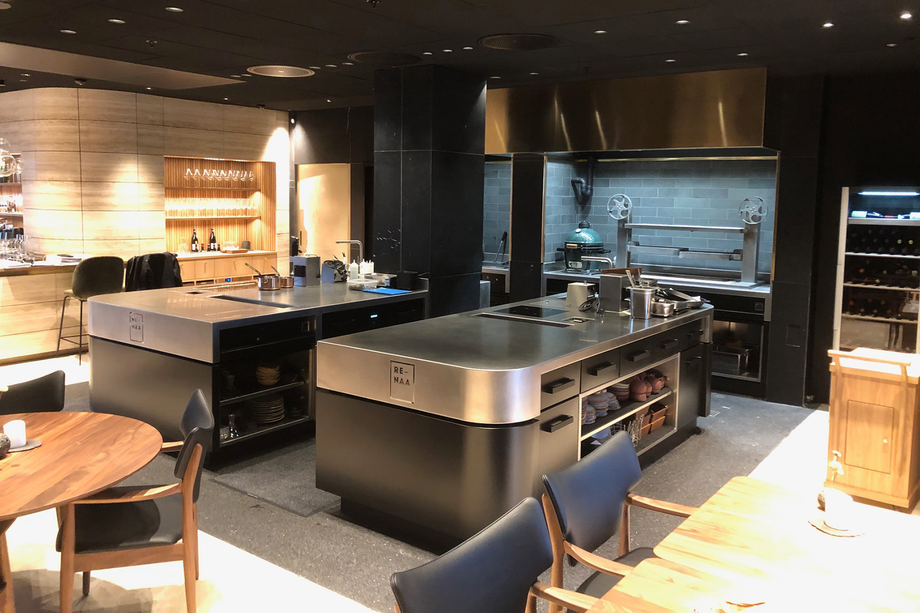 dabei wurden die kochinseln so angeordnet, dass ein teil davon auch für anlässe wie apéritifs und stehanlässe genutzt werden kann. und wer ganz im stile von ron dennis' saxum essentia (siehe beitrag in der kolumne oben rechts) fürstlich zu abend speisen und sich von der kochkunst der küchenbrigade vom the capra gleichwohl unterhalten wissen möchte, blickt von seinem chef table direkt auf einen der edlen edelstahlkorpusse.