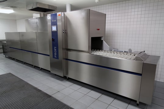 montage einer hobart PREMAX FTPi - bandspülmaschine mit der weltneuheit der kompletten selbstreinigung. zeitgleich zum reinigen des üblichen spülguts werden parallel auf einem separaten transportband tabletts gespült, ohne den platzbedarf zu erhöhen.